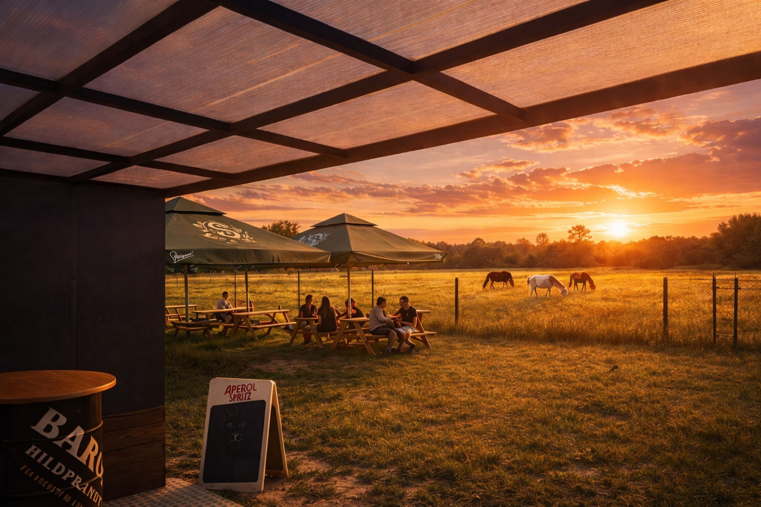 Venkovní posezení u botičského potoka s výhledem na koně, kde se nikam nespěchá. Místo v zeleni, ideální na setkání s přáteli nebo jen klidnou chvíli pro sebe s pivem v ruce.